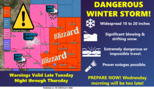 5 AM MDT Tuesday March 12: A major, potentially crippling winter storm is forecast to impact southeast Wyoming and the Nebraska Panhandle from late Tuesday night through Thursday. Blizzard and Winter Storm Warnings remain in effect. This is a dangerous winter storm! MAKE PREPARATIONS NOW!
