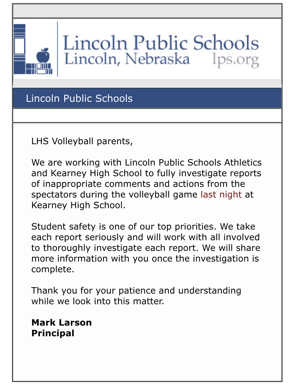 Lincoln High Principal Mark Larson sent a message to families of volleyball players on Wednesday afternoon acknowledging reports of “inappropriate comments and actions from spectators.” Larson said in the message that student safety is one of the school’s top priorities and that he will update families when the investigation is complete.