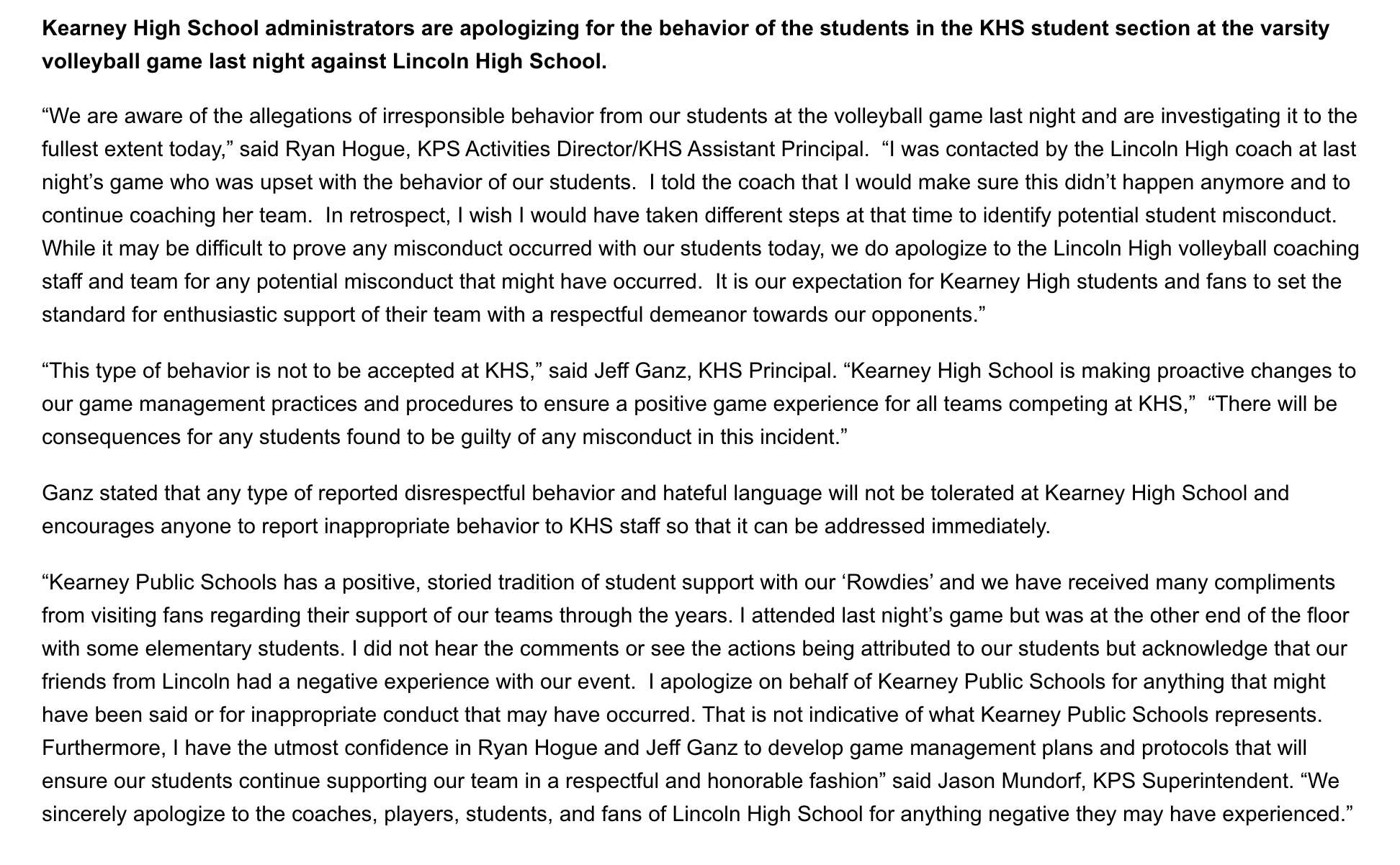 “I apologize on behalf of Kearney Public Schools for anything that might have been said or for inappropriate conduct that may have occurred. That is not indicative of what Kearney Public Schools represents,” Mundorf said. “Furthermore, I have the utmost confidence in Ryan Hogue and Jeff Ganz to develop game management plans and protocols that will ensure our students continue supporting our team in a respectful and honorable fashion.”