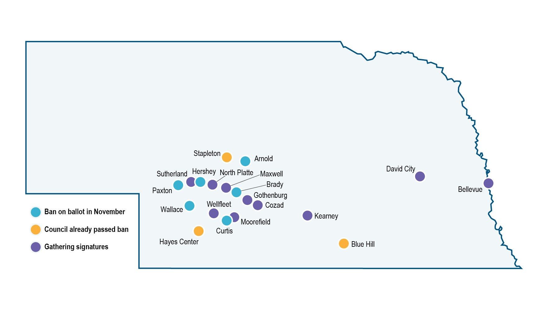 Through the summer, local residents and Dickson’s group gathered enough signatures to put the ban to a vote in six other Nebraska towns this November – Arnold, Brady, Curtis, Hershey, Paxton and Wallace.