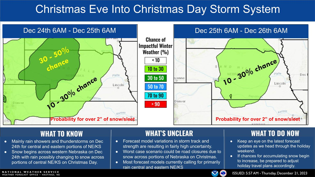 Rain, possibly changing to snow, across portions of central Nebraska could begin on Christmas Eve.