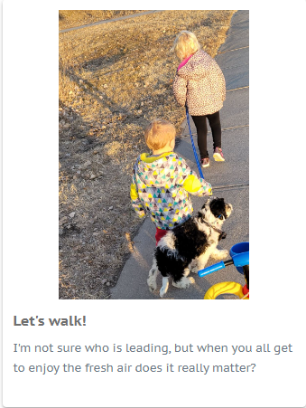 Amy Penny of Grand Island submitted her photo, titled Let’s Walk!, of her two kids going on a walk with their new puppy, a cockapoo named Dusty. She included the caption, “I’m not sure who is leading, but when you all get to enjoy the fresh air, does it really matter?”