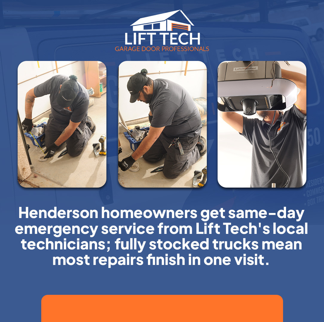 Lift Tech Garage Door Professionals in Henderson delivers fast, reliable garage door repair for homeowners. They provide garage door opener repair, garage door spring replacement, and routine garage door maintenance. Their residential garage door service addresses issues like noisy doors, misaligned tracks, or faulty remotes. Emergency garage door service is also available, with local technicians responding quickly and completing repairs often in a single visit. Choosing nearby service reduces downtime, lowers accident risk, and keeps doors operating safely and reliably.